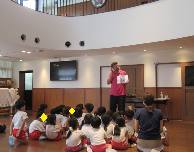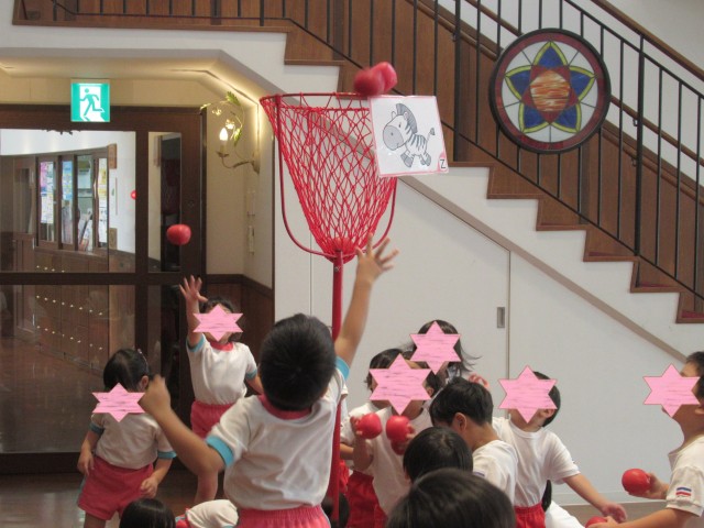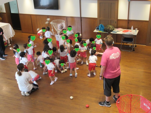 ジャレド先生が動物の名前を言い、音楽が流れてる間だけ玉入れOK!!!