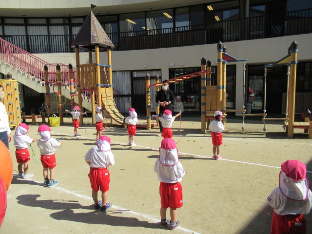 縄跳びを配ってもらって、自分で縄をほどいたり、輪っかを作ってその中で遊んだり、カトレアさん(年長)は、駆け足飛びまでしていましたよ~凄く楽しそうでした♬