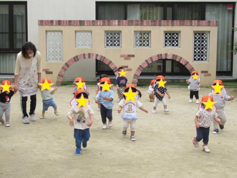 「よーい ドン!」の声に合わせてかけっこあそびをしました。みんなの「よ~い」の