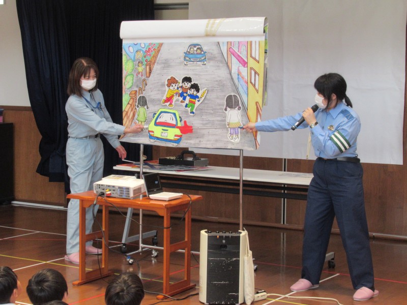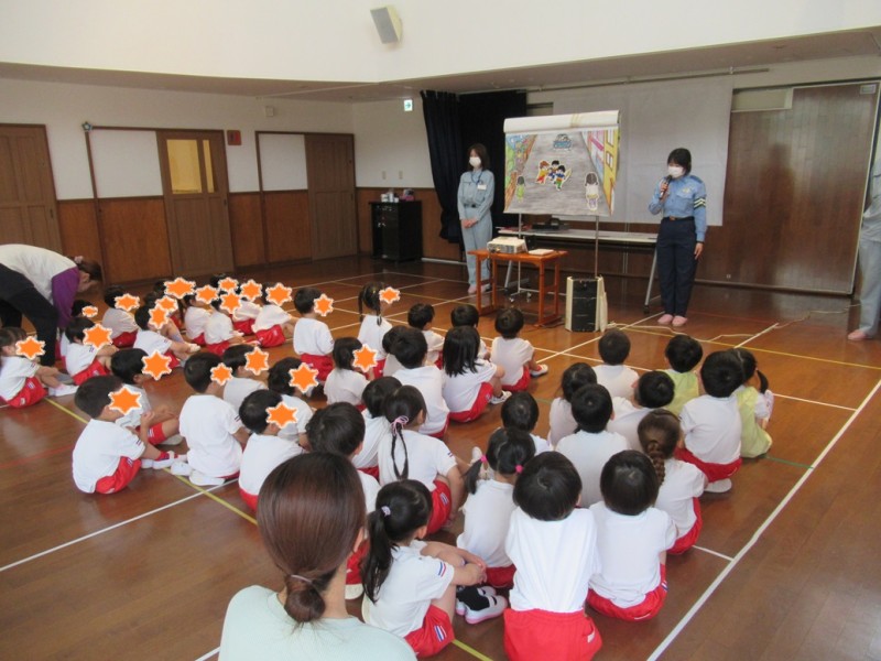 今日はお巡りさんと区役所の方に来て頂き、『交通安全教室』に参加しました。