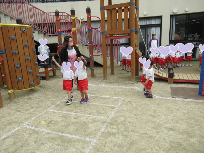信号の見方、横断歩道の渡り方を学んでから園庭へ出て、