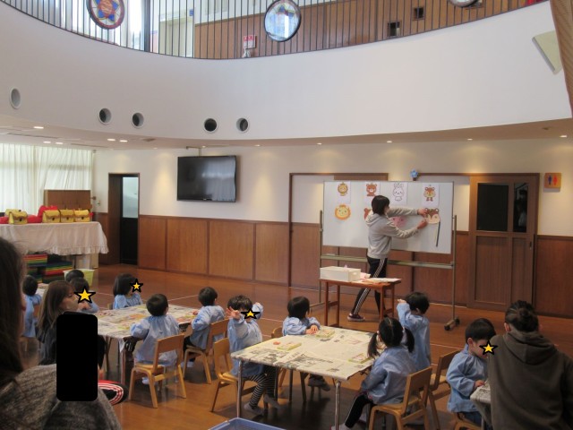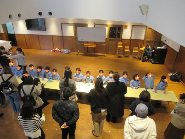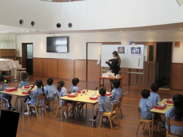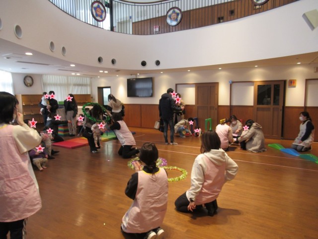 マーガレット組:キラキラ折り紙を切ったり、ビーズを入れて万華鏡を作りました*+。*+お遊戯も披露出来ました!