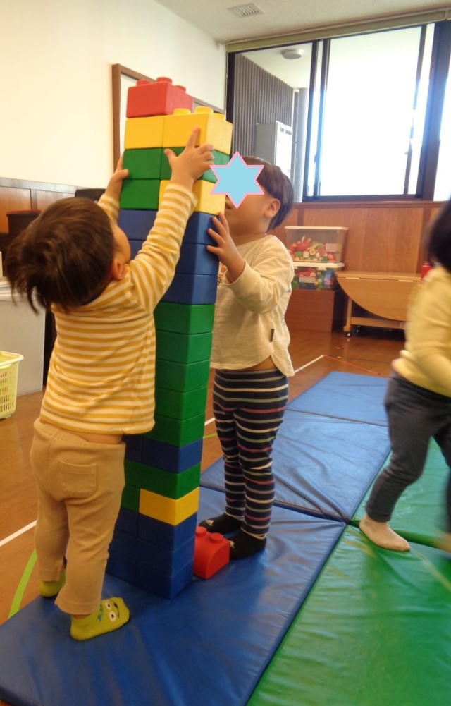 ブロックを高く積んだり横向きにしてみたり、いろんな創意工夫をしています☆