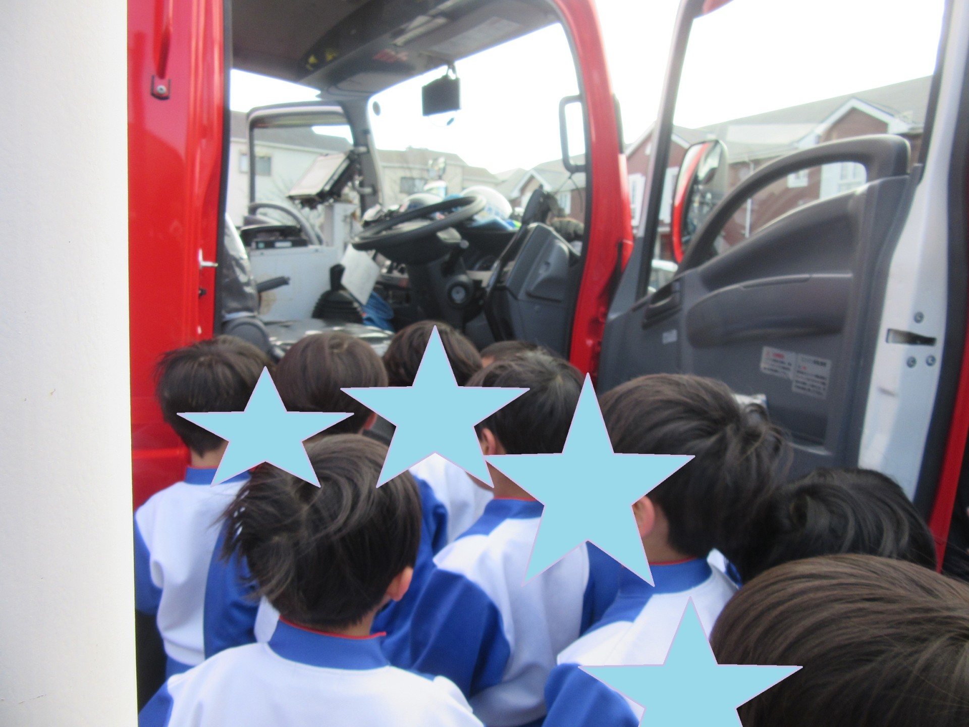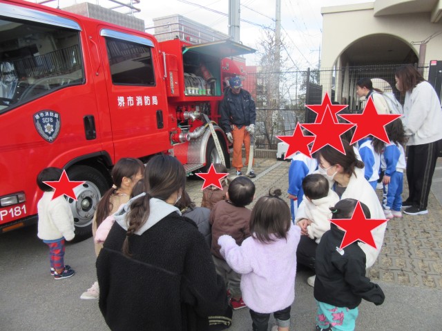 消防士さんが来てくれて、実際に消防車を見せてもらったり