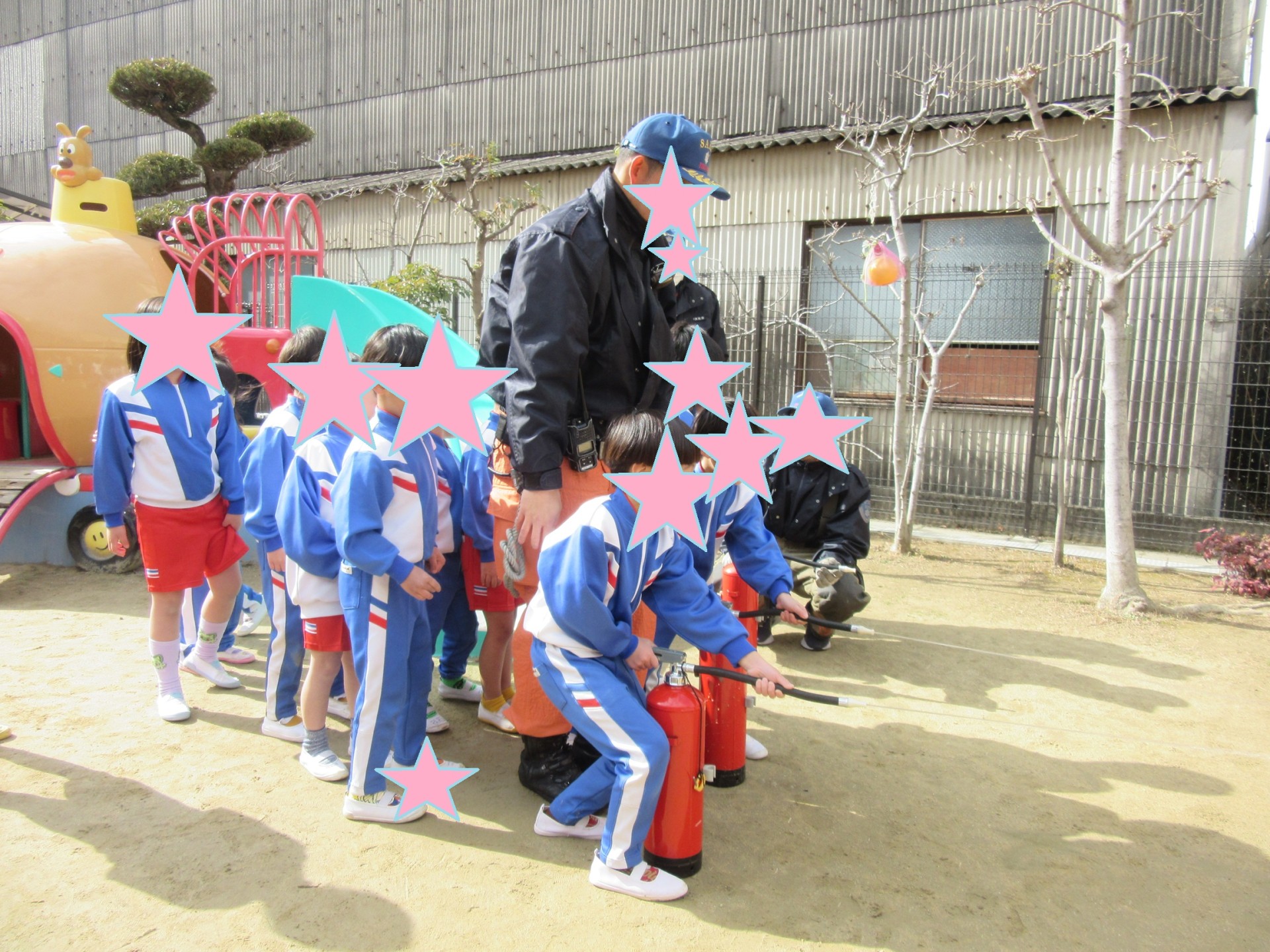 消火器を使って火を消す練習をしましたよ☆