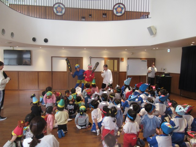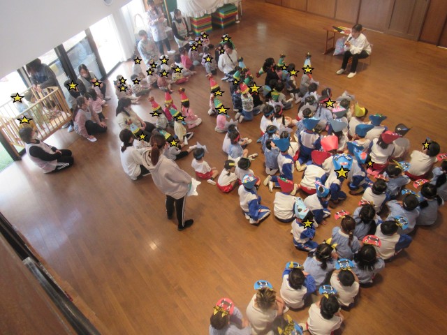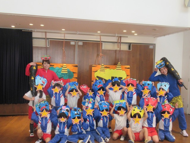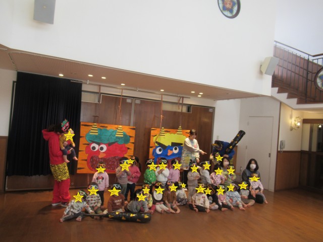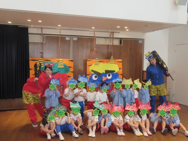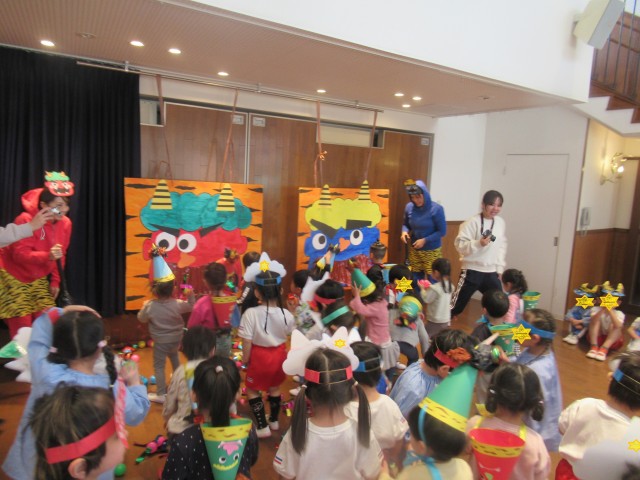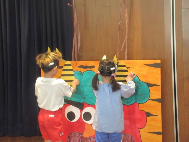 紙芝居を見たり、クイズをしたり、鬼の顔にパーツを貼り鬼を完成させたりと、凄く楽しい時間を過ごしました。鬼さんが