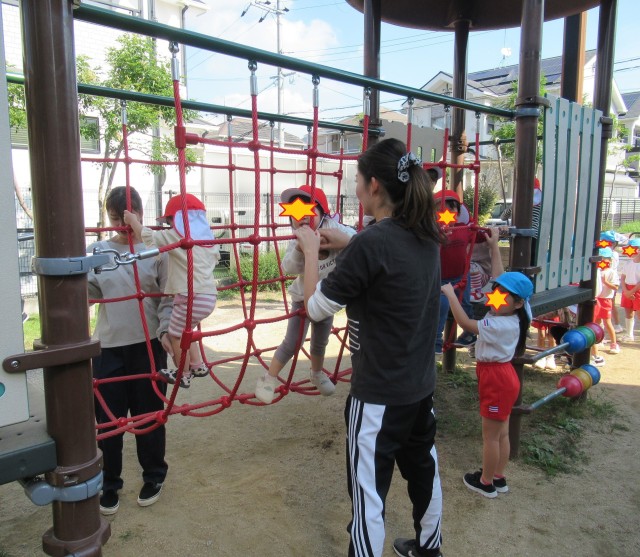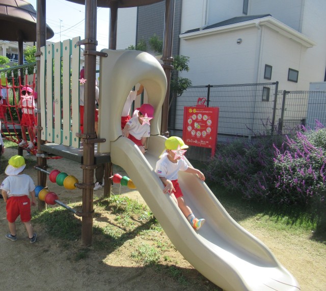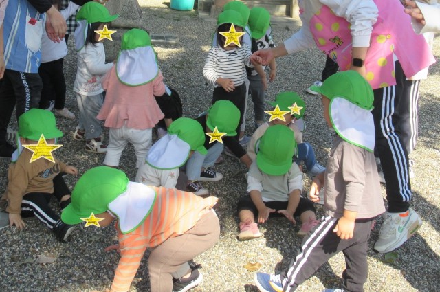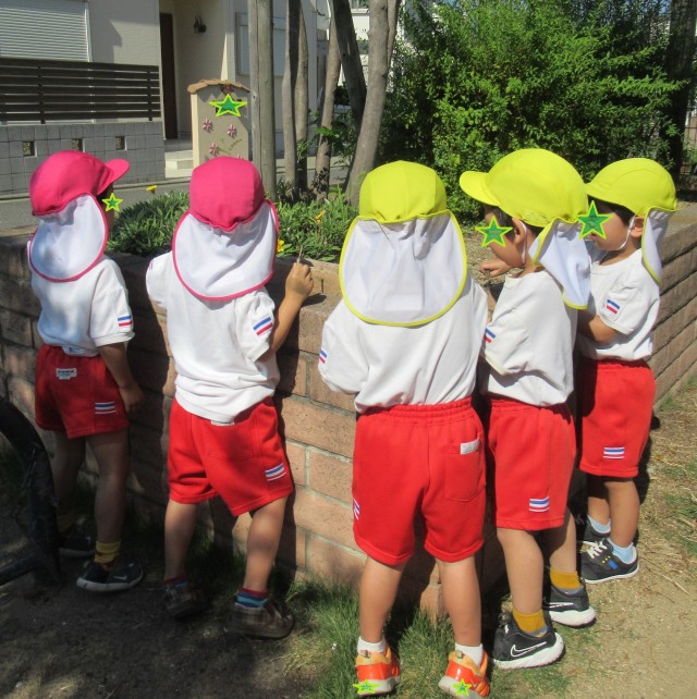 昨日は全学年お散歩に出かけました!2歳児は5歳児のお兄さんお姉さんに手を繋いでもらい、次に3歳児と4歳児のグループで行きましたよ☆遊具で遊んだり、虫を探したりとても楽しそうでした。
