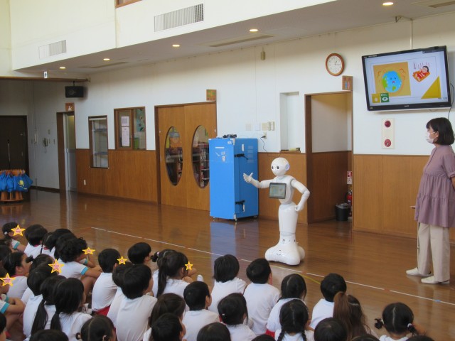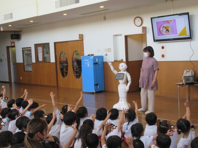 午後からソフトバンクの方とペッパー君が来て下さり、最初はペッパー君とジャンケン大会をして、そのあとは ”SDGS” のお勉強です。お水や食べ物の大切さをペッパー君と楽しく勉強できました♪