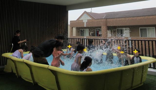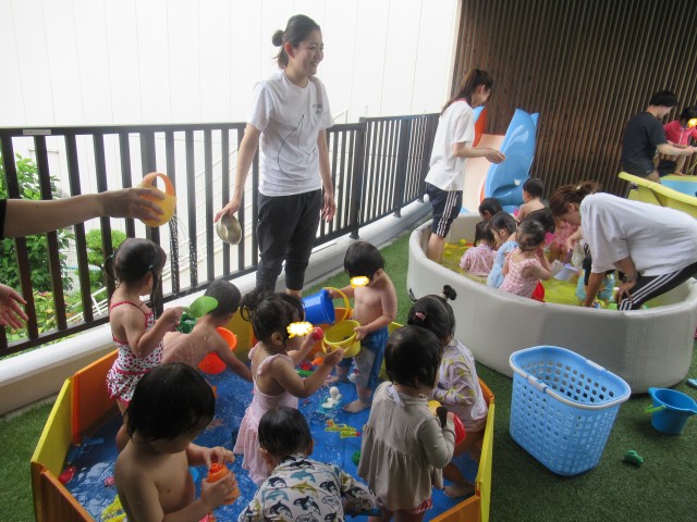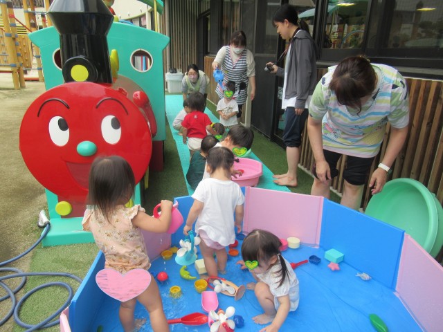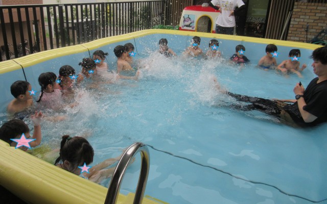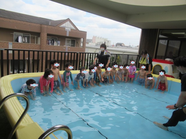 今年に入って初めてのプールでした!!体操教室の先生が来てくれる日だったので3~5歳児は一緒にプール指導を受けました。