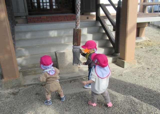 近くの神社にお散歩に行ったり、園のホールで輪になってお弁当を食べました。