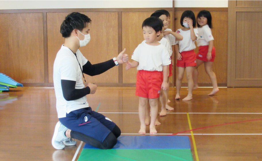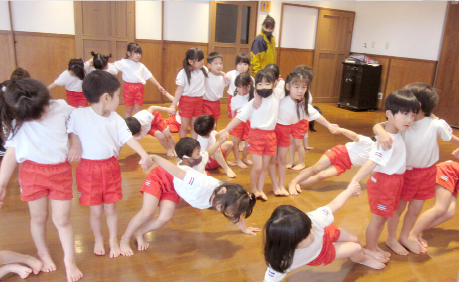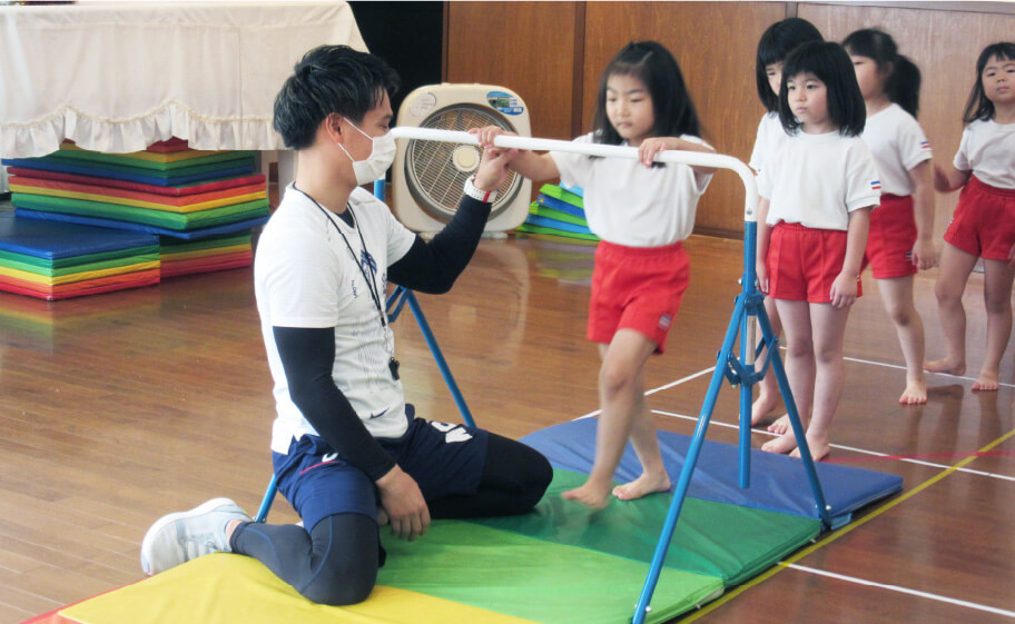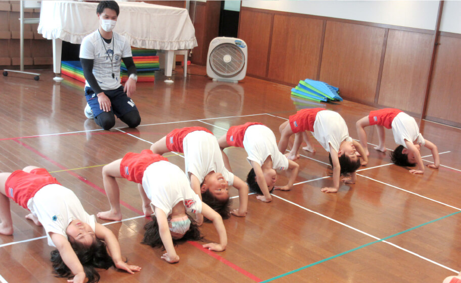 鉄棒やマット、跳び箱など、さまざまな運動を通して基礎体力づくりに取り組みます。