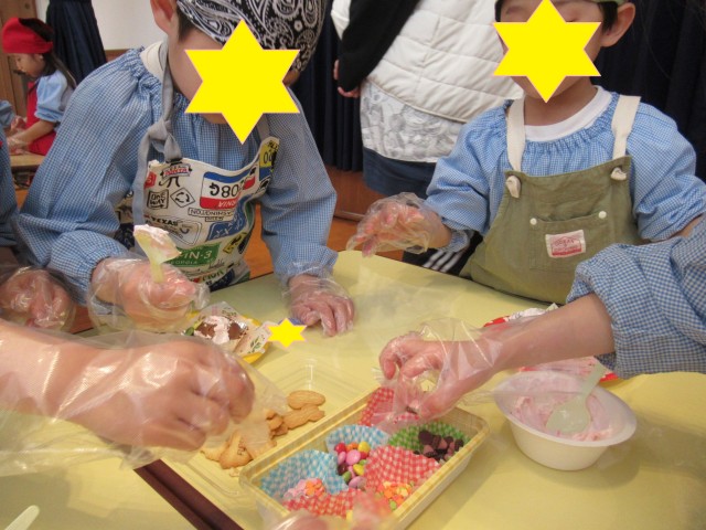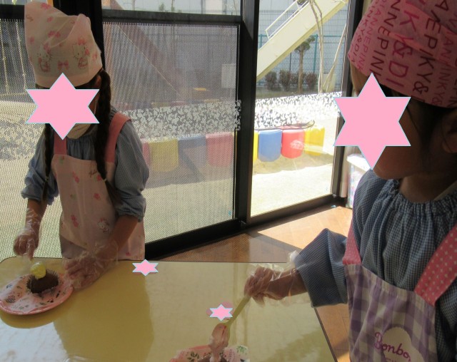 給食の先生が焼いてくれたカップケーキに、クリームをぬって、思い思いのトッピングをしました!