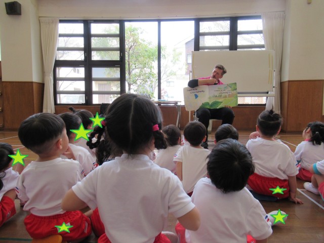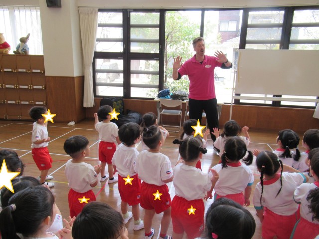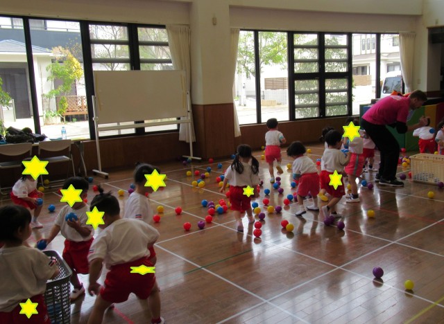 今日はボールの色を英語で伝えられ、その色のボールを集めるゲームをしましたよ。