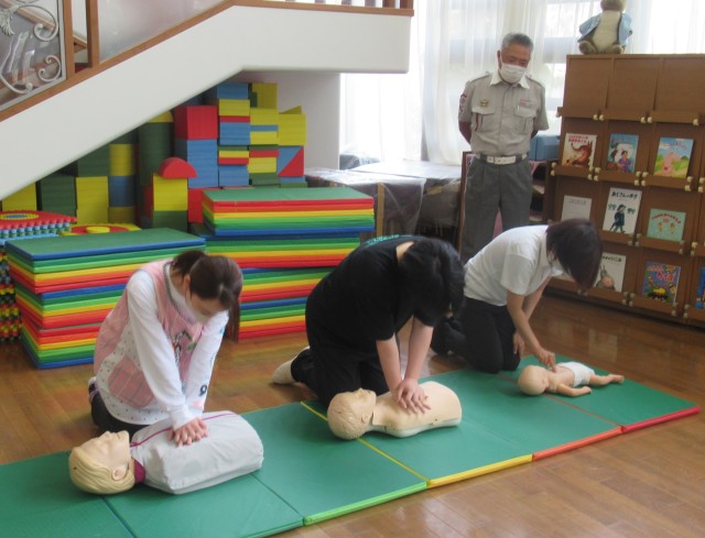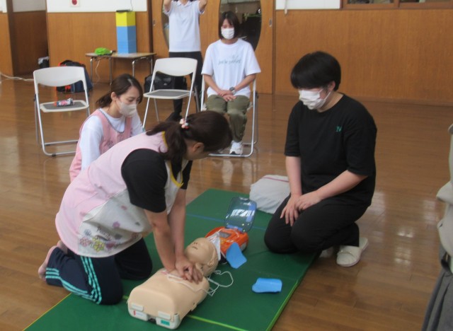 乳児・小児・大人の胸骨圧迫方法を練習し、意識不明時の対応を再度確認しました。
