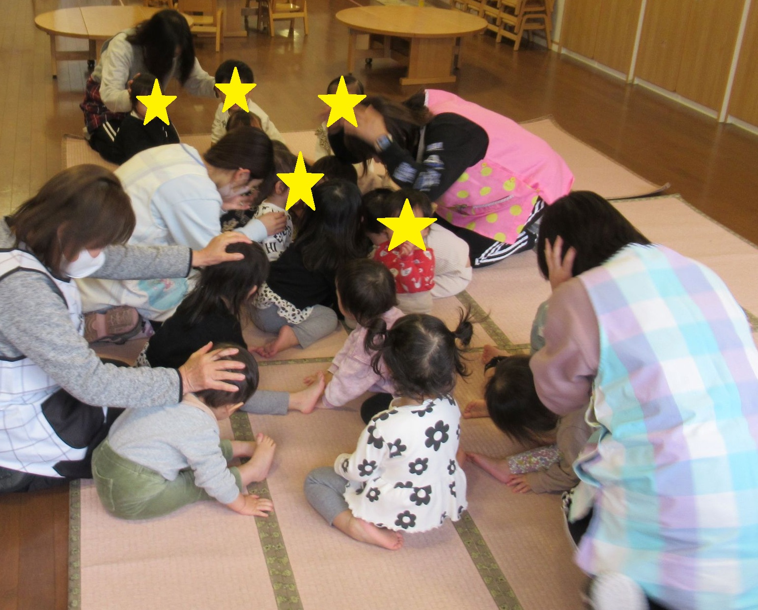 頭を守って体を低くするダンゴ虫のポーズを