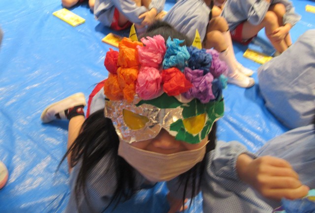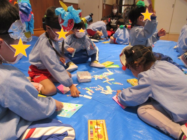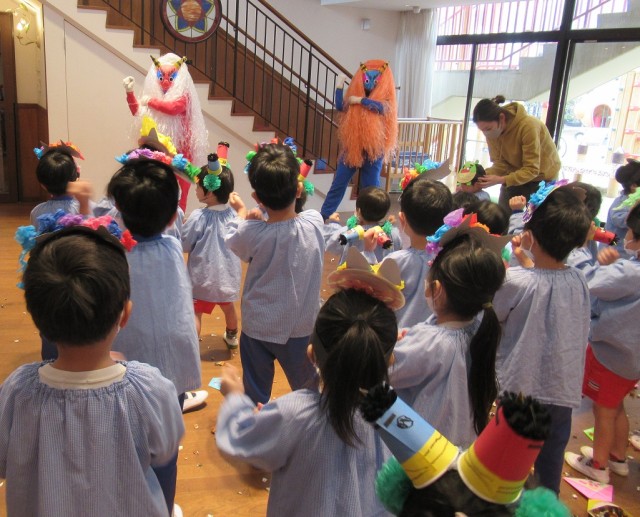 鬼さんに折り紙で作った豆を投げた後、一緒に「鬼のパンツ」を踊りましたよ☆