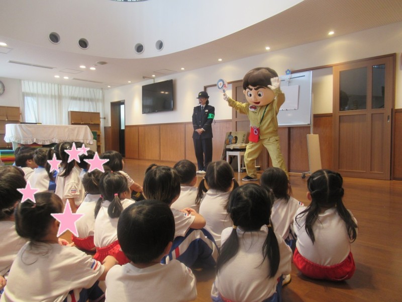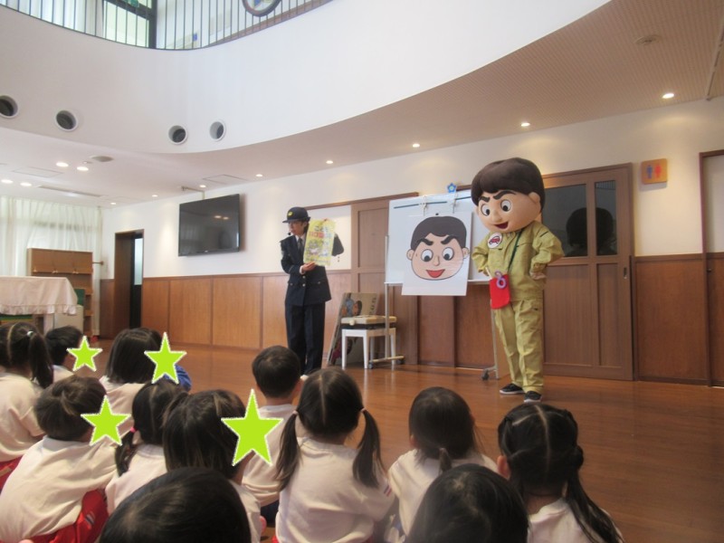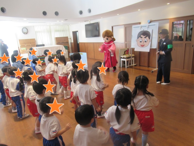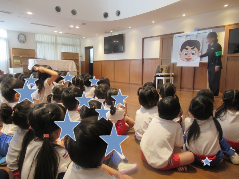 不審な人に出会ったときの対処の仕方や誘拐されないためにはどうしたら良いのかなどをお巡りさんと『ゆうかい するぞう』と一緒にお勉強をしました。